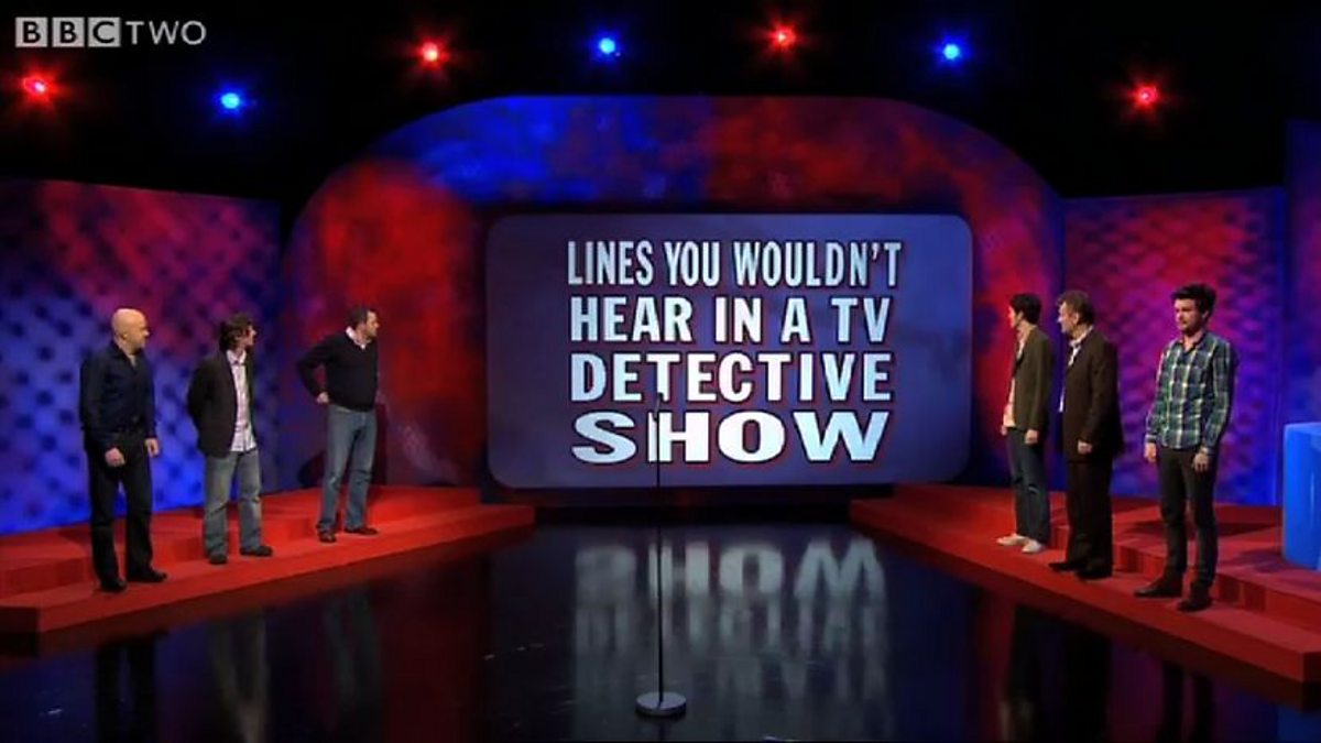 Lines you wouldn't hear in a TV detective show are suggested by Dara O Briain's guests Hugh Dennis, Ed Byrne, Andy Parsons, Chris Addison, Miles Jupp and Jack Whitehall.