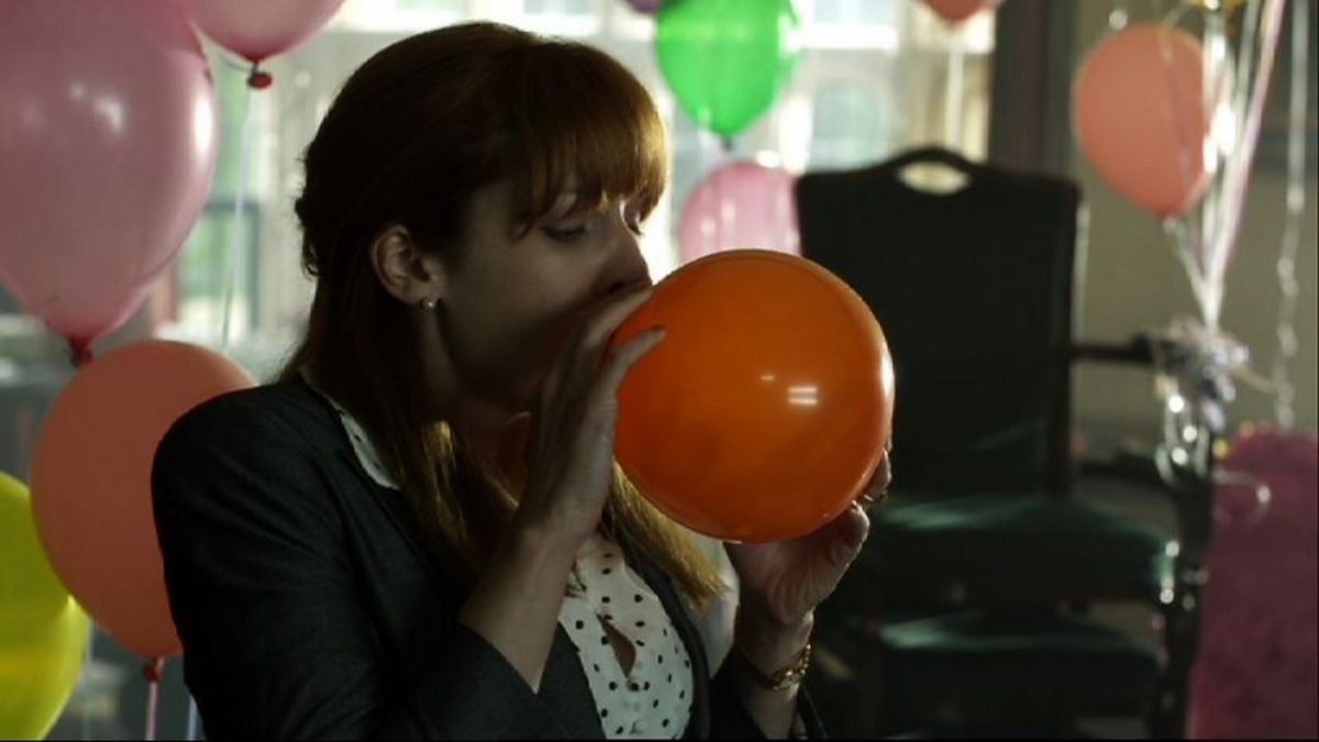 Caroline (Katherine Parkinson) inhales helium when she thinks she is on her own, just as Bib (Darren Boyd) arrives to say his goodbyes...
