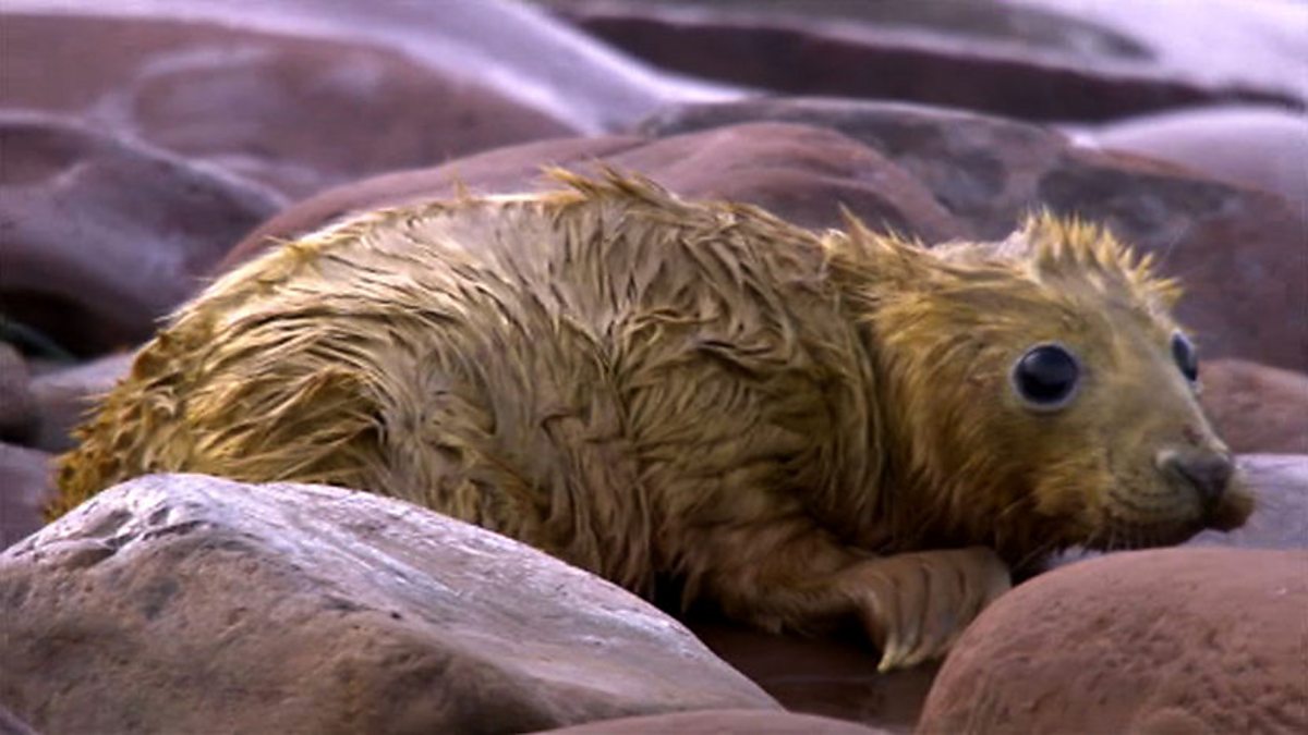 A swimming lesson in stormy seas throws a grey seal pup in at the deep end.