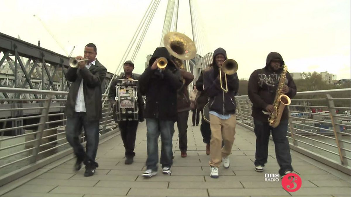 Soul Rebels Brass Band perform Gnarls Barkley's 'Crazy' while crossing Golden Jubilee Bridge on the opening day of London's Jazz festival 2010.
