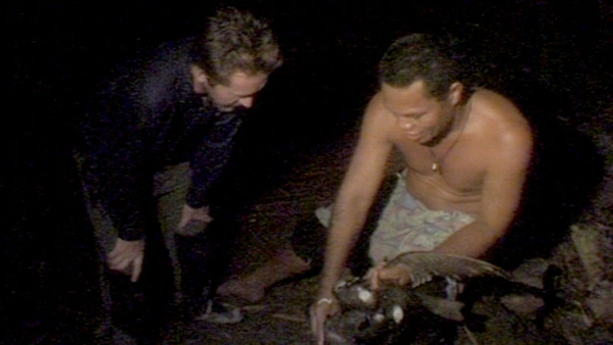 Bruce Parry tries imitating bird calls with the Anutans in order to catch birds.