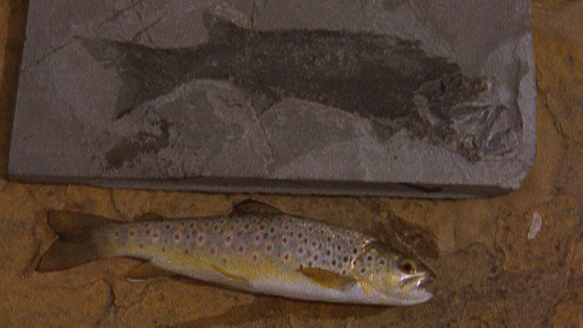 It was underwater that the story of animals with backbones - our ancestors - was getting underway. It's in the quarries of Caithness in Scotland where they can be found. A live brown trout of today is very similar to the fossil - but younger, by 400 million years. Further north, in Orkney, the same lake sediments are preserved as flat as the day they were laid down. Because they split easily they are ideal for the building and paving stone much sought after by classy architects... or by collectors of exquisite finds.