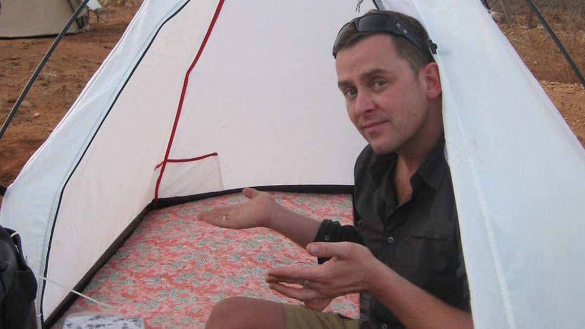 Scott Mills gives a guided tour of the Base Camp set up for the Red Nose Desert Trek team ahead of their 100km trek through Kenya's Kaisut Desert.