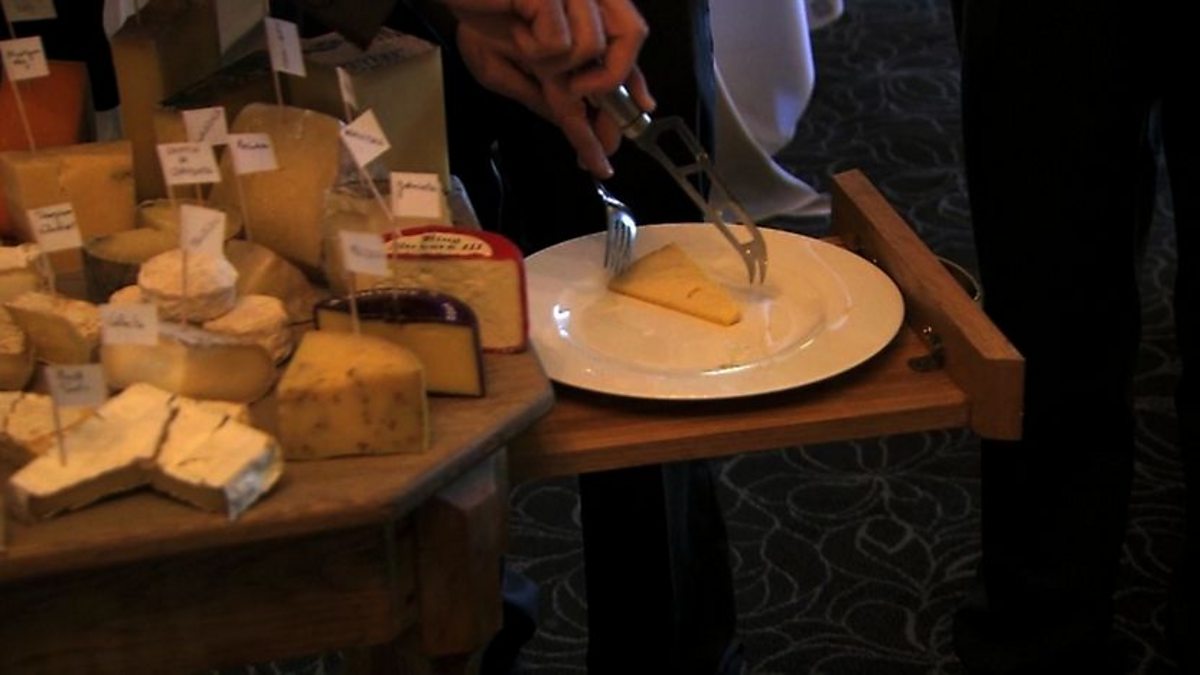 Michel talks Ashley and Tom through the cheese trolley and explains the layout. He demonstrates how to cut and serve the cheese and is amused when Ashley asks what he should do if someone asks him to grate it onto the plate!