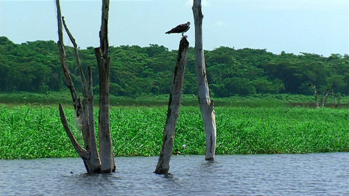 Steve Leonard is looking for ospreys in Cuba. Satellite tracking leads him to a lake down the coast - Embalse Najasa. At the lake are plenty of ospreys, but not the one he's looking for. This lake is osprey heaven - it is full of fish and the perfect spot to refuel. Places like this are why their migration makes so much sense - the further south they go, the better the fishing gets. People go fishing here too, but there is no competition. Steve talks to a local fisherman, who tells them that watching where the ospreys dive is the best way to find lots of fish. The ospreys never miss their fish - it's a catch for sure when they're there.