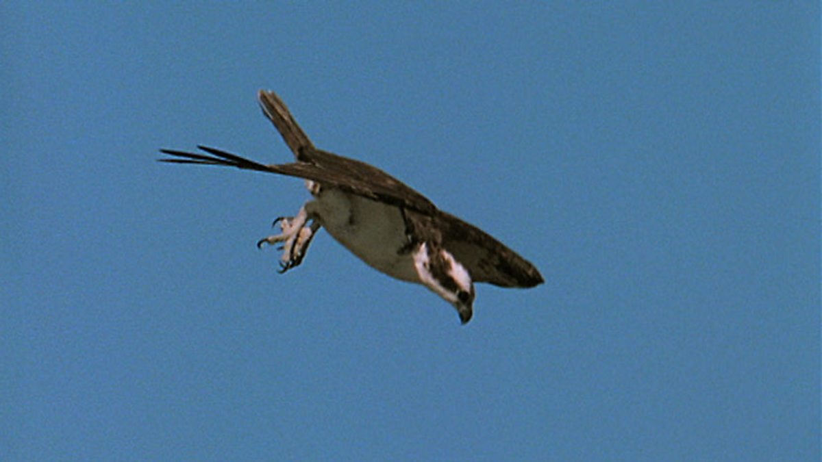 Migrating ospreys have problems - they have to catch fish every day to keep going. They are superbly equipped for the job. They have eyesight so sharp that they can see a fish underwater from 30 metres up. Split second calculation of the target speed, depth, size - and they dive. Talons open. Hip joints swing the weapons forward into strike position. Young ospreys have not been taught to fish - they learn through practice. Learning fast is a matter of life and death.
