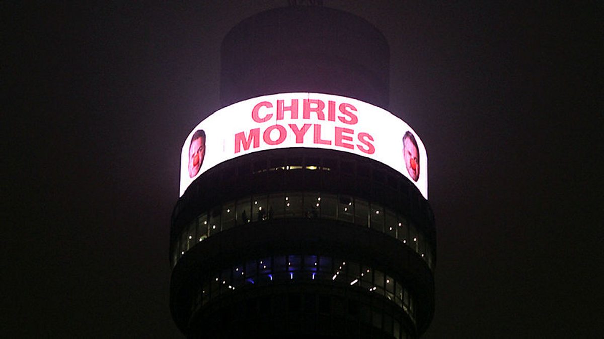 Chris Moyles gets a nice surprise with a huge projection of his face on the BT Tower.