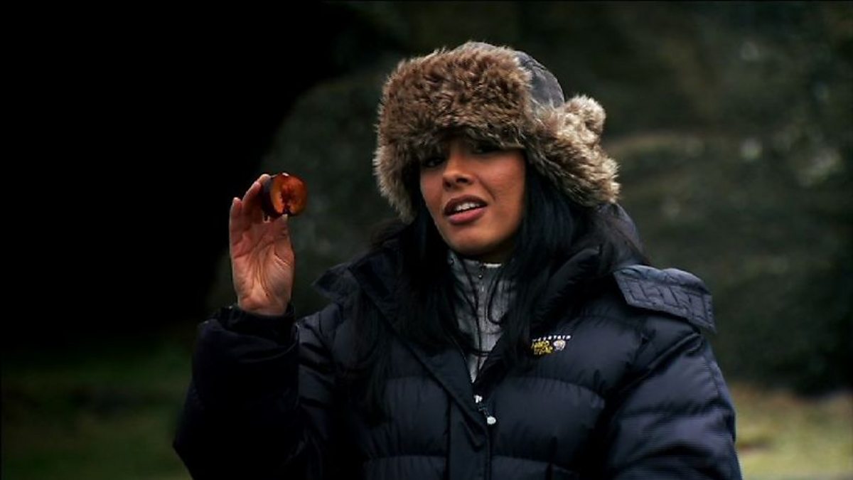 Reporting from Eyjafjallajokull volcano in Iceland, Liz Bonnin explains the Earth's inner structure using a plum to show the different layers inside our planet. She explains why hot bits of the mantle that are rising melt to form magma.