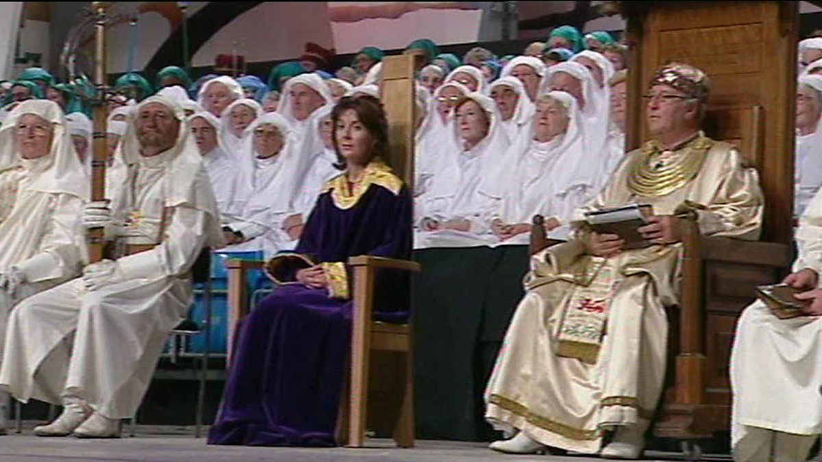 Clip hanesyddol o Mererid Hopwood, y ddynes gyntaf i ennill Cadair Eisteddfod Genedlaethol, yn cael ei Chadeirio yn Ninbych yn 2001. Yn cynnal y seremoni mae'r Archdderwydd Meirion a'r diweddar Ray Gravell yw Ceidwad y Cledd. Am y tro cyntaf yn ei fywyd mae'r Archdderwydd yn rhannu cusan ?hrifardd ar ddiwedd y clip!