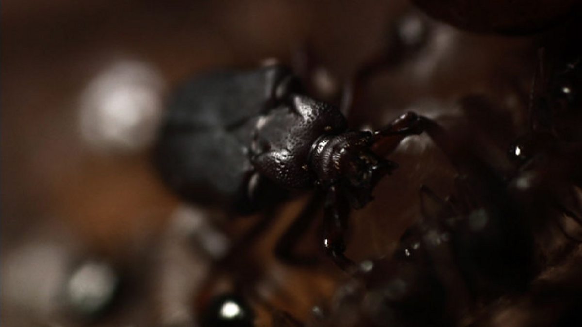 A beetle invades the honey ant nest. At first, it is attacked by ants but their jaws can't break its tough exterior. Soon, it is accepted by the colony - maybe because it starts to smell like the ants it lives with. Once it is accepted by the ants and left alone, it starts to feed on the ant larvae.