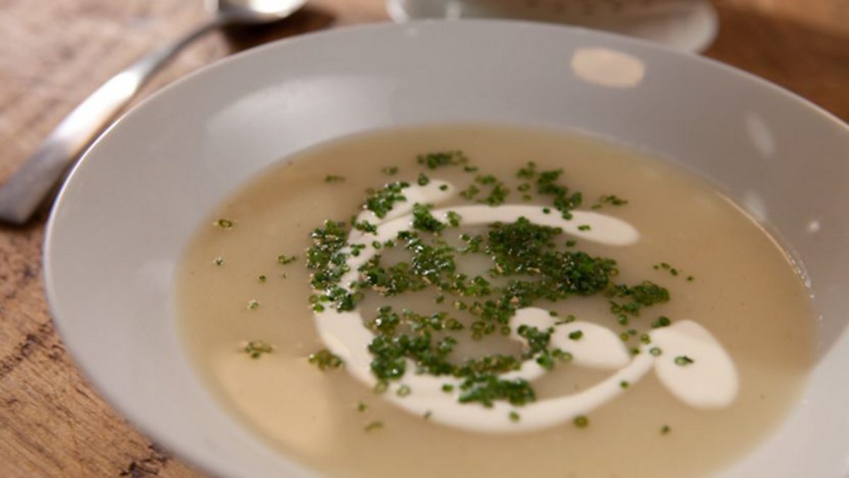 Simon Hopkinson demonstrates how to make potato soup with soured cream and chives.