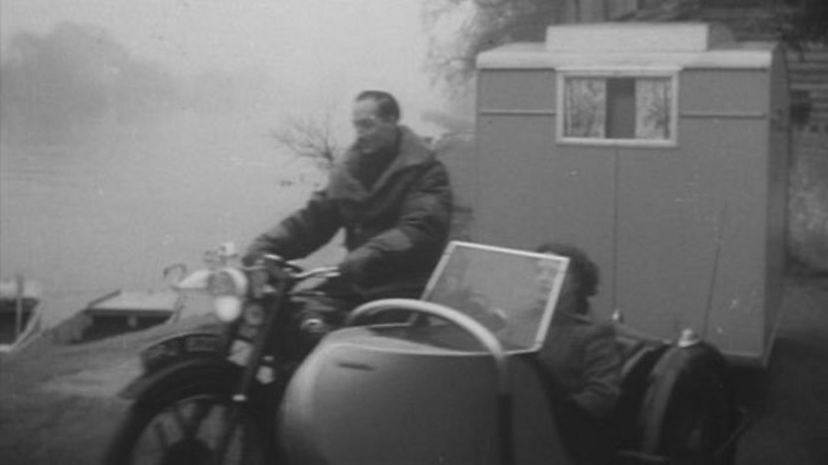 A BBC news item from 1953, showing a couple holidaying next to a lake with their caravan. This extract has no audio.