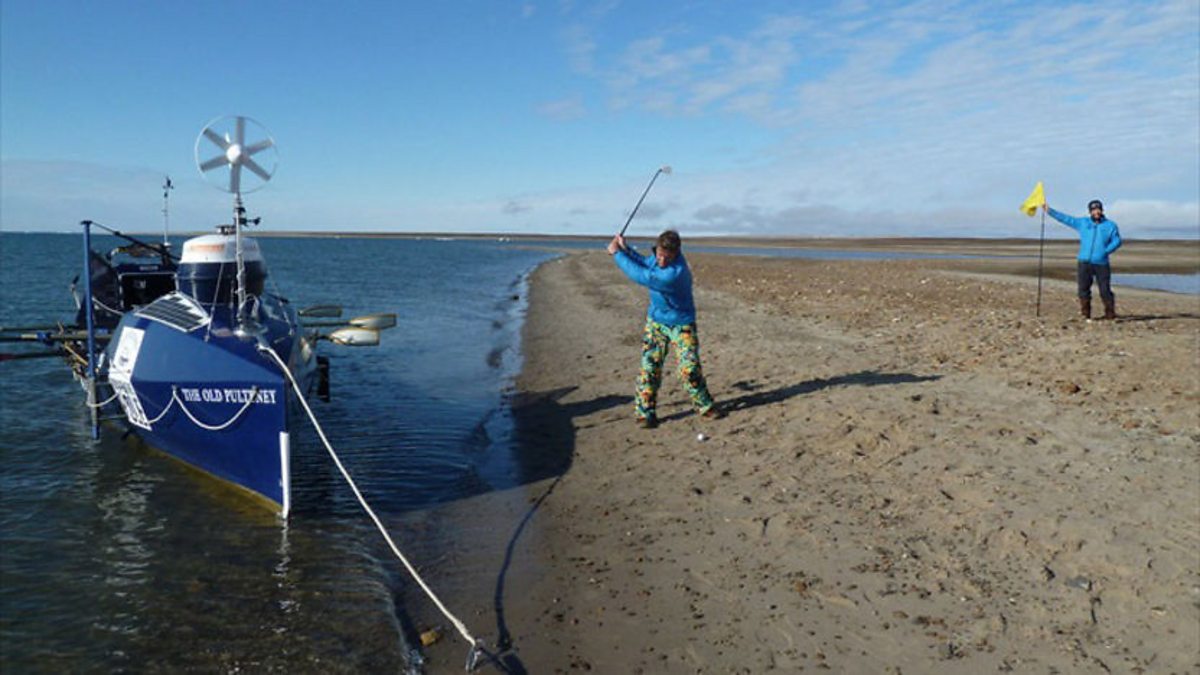 Crewman Billy Gammon sets a course record on the Cornwall Island no hole golf course. Jock Wishart and his crew are attempting to row the Arctic. Joining him is cyclist Mark Beaumont, on board the tiny boat to film the audacious attempt.