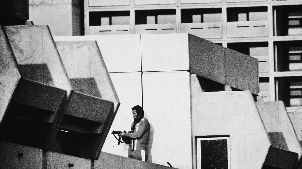 Photo: A German policeman on patrol after the shootings (Hutton Archive/Getty Images).