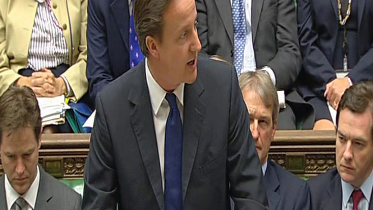 Footage cuts from the square to the House of Commons where Prime Minister David Cameron is starting to make his statement; seated behind him are (left to right) Nick Clegg (Deputy Prime Minster), Owen Paterson (Secretary of State for Northern Ireland) and George Osborne (Chancellor of the Exchequer).