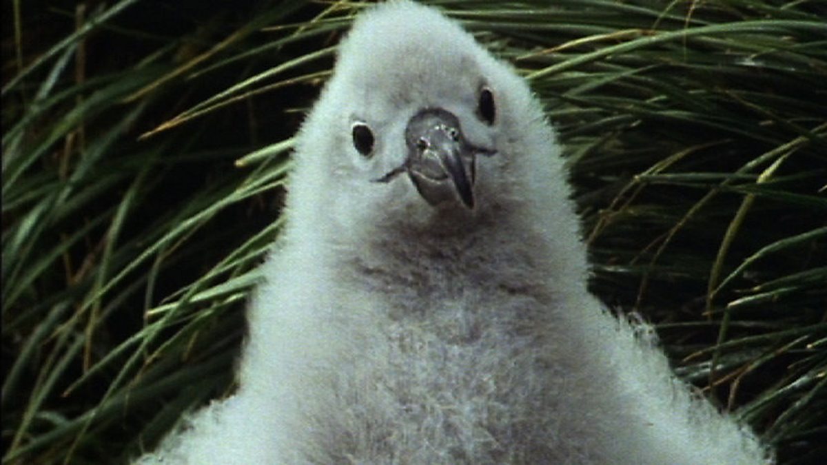 A grey-headed albatross flying around the coast of South Georgia has a radio transmitter on its back. This allows scientists to learn where it caught the food that it is bringing back for its hungry chick. The large fluffy chick belongs to a colony that has been studied by a British team for more than fifteen years. In the old days, birds were weighed with a simple spring balance but now researchers use electronic scales concealed inside a fibreglass nest. This means that no one has to touch the chick to weigh it. Instead, the scales transmit a reading every ten minutes to a nearby hut in which sits a watching scientist with recording apparatus. This reveals that one parent brings 500 grams of fish, lamprey and krill to the chick every three days. Signals to the satellite reveal that the adult has travelled several hundred miles to get this food.
