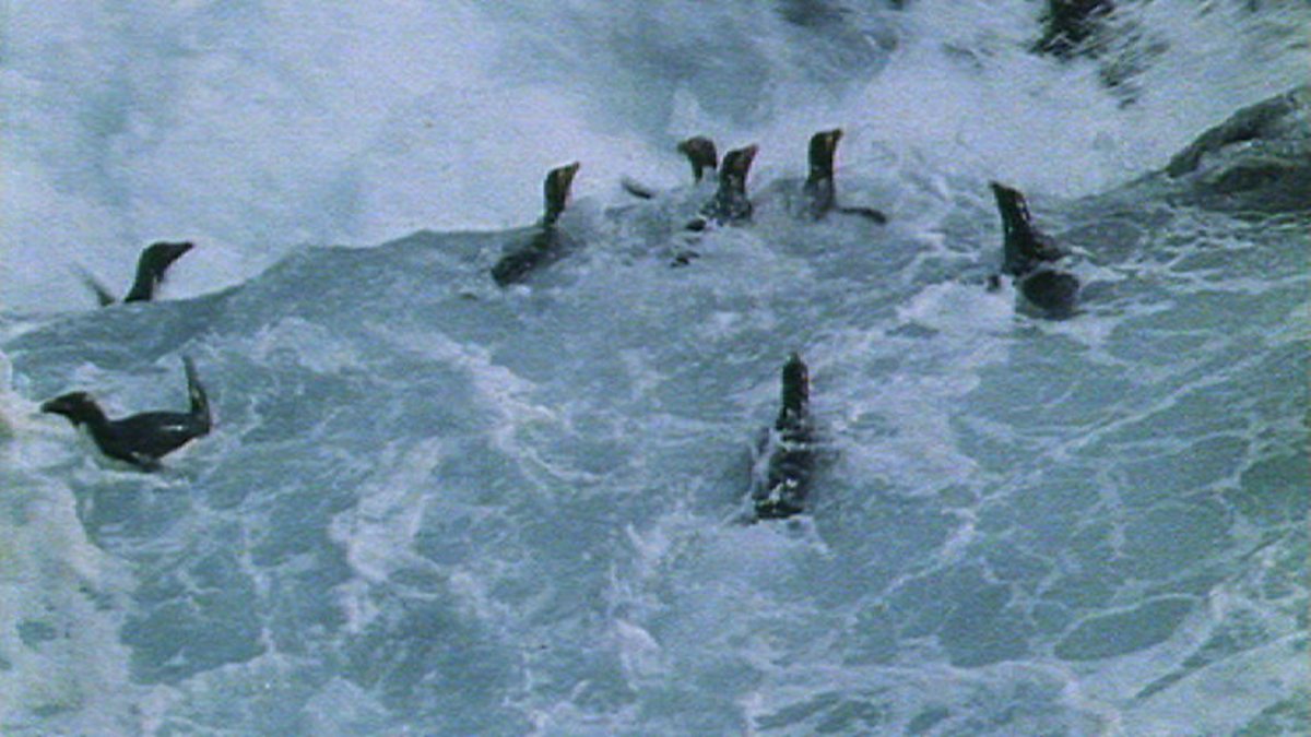 The pounding surf of the great Southern Ocean beats on the rocky shore of South Georgia, yet Macaroni penguins swim in these rough seas and are desperate to get ashore. Their flippers are little help out of water and all they have to give them a grip on the slippery rock are the small claws on their feet. Meanwhile breakers crash over them, knocking them back into the water and tossing them around in the surf. At the end of summer, life is becoming increasingly difficult for the Macaroni penguins. They need to get ashore to feed chicks that are almost fully grown and have massive appetites. With the approach of autumn, the weather will worsen. Massive depressions will rush around the fringes of the Antarctic continent, creating huge gales that gust at more than 100 miles per hour. Before long, the temperature will drop below freezing and all the wildlife here will be in a desperate race to finish breeding.
