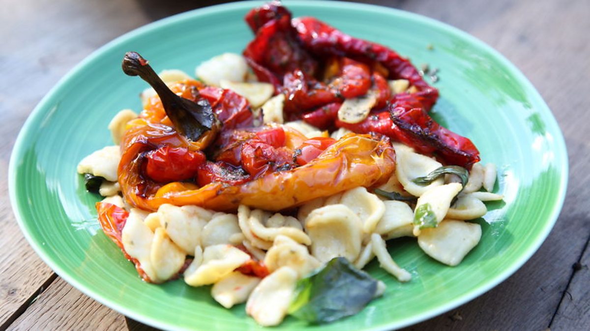 A gorgeous supper dish inspired by flavours from the Mediterranean - roasted peppers, tomatoes and a simple basil sauce. Serve with your favourite pasta.