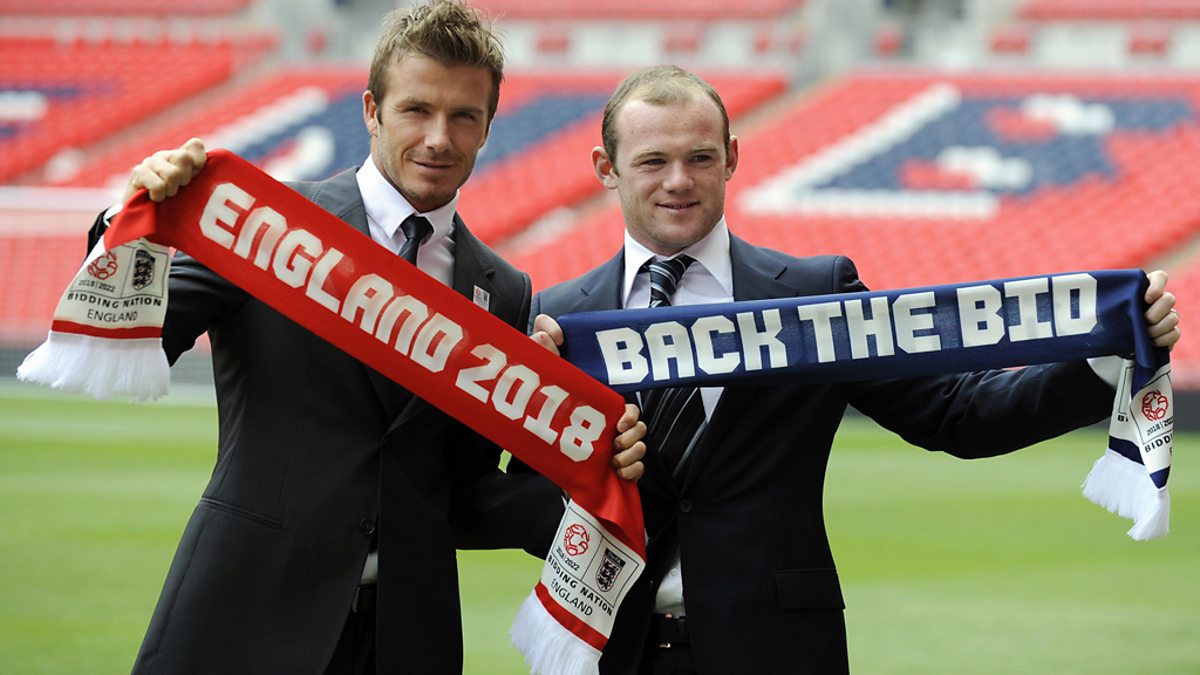 (Image: England footballers David Beckham (L) and Wayne Rooney (R) pose during a photocall to launch The England 2018/2022 World Cup. Credit: Getty Images)