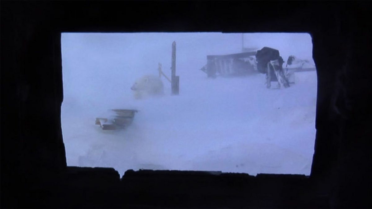 Cameraman Mark Smith films through the window as a polar bear pays them a visit and decides to bed down in their back yard.