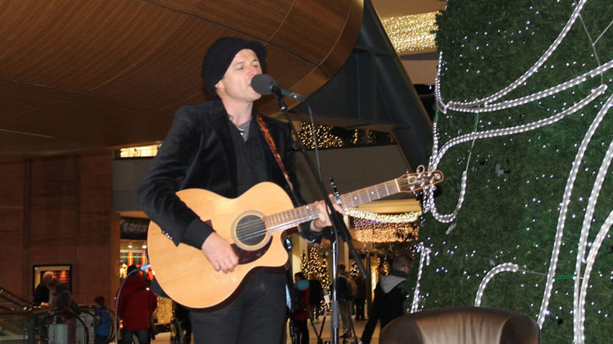 In the cold of Belfast's Victoria Square INXS front man Ciaran Gribbin performs Mystify.