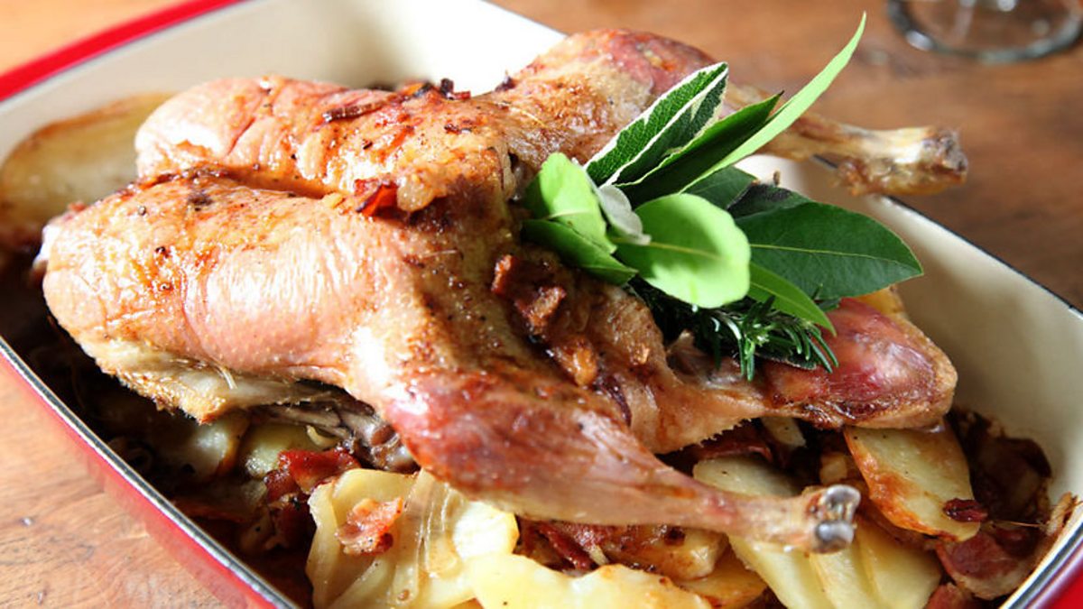 Duck is a really tasty alternative to turkey for Christmas lunch, or even a New Year's supper. Roasting the bird on top of the potatoes doesn't just make things easy, the real point is that the potatoes absorb some of the duck fat, making them very tasty indeed.