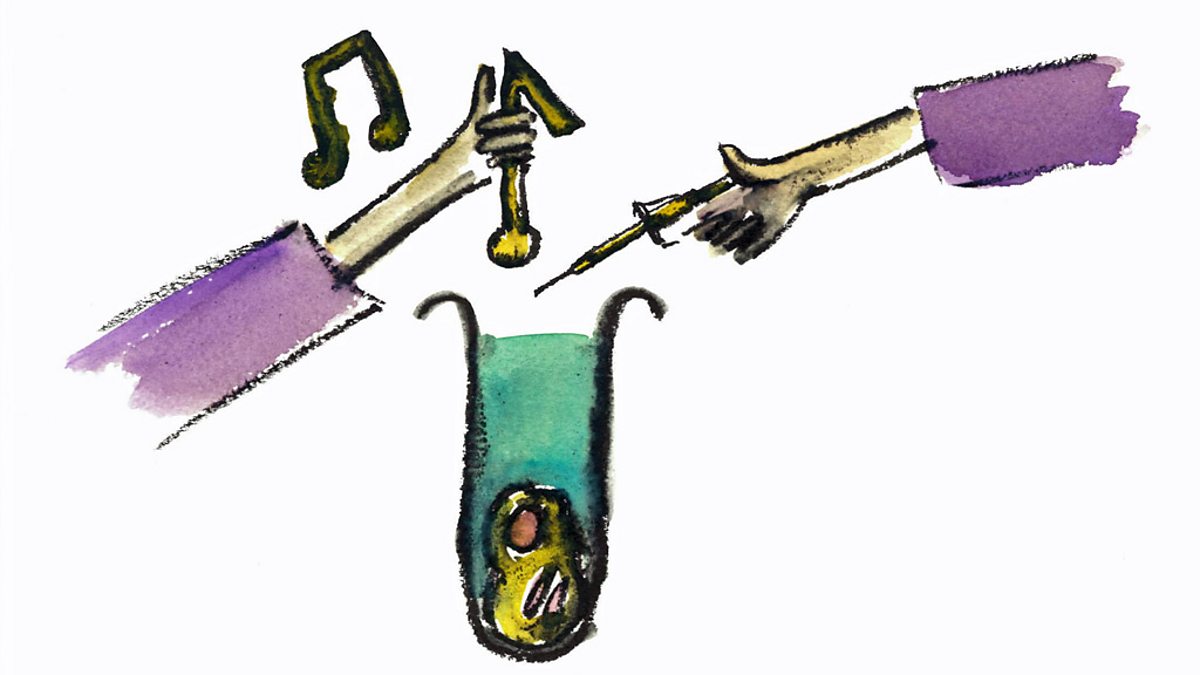 Illustration by Emily Kasriel: experimenting to improve life through immunization and music.