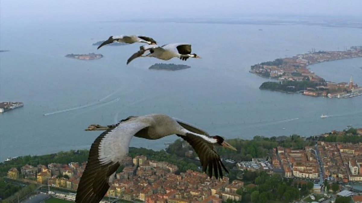 Common cranes fly over Venice (Narrated by David Tennant)
