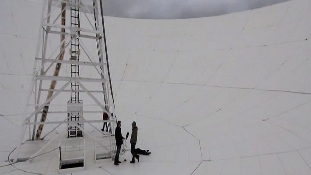 Tony Livesey climbs the Lovell Telescope at Jodrell Bank Observatory ahead of his special live show from Stargazing Live.