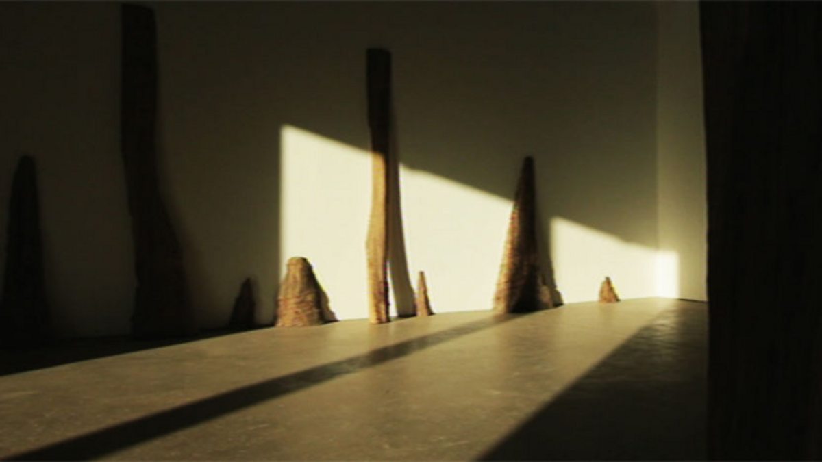 Video footage of wood sculptures and the artist David Nash talking about his work. Commentary about how the artist has known Blaenau Ffestiniog nearly all of his life, how he and the natural world around him are influenced by the weather and that these natural cycles affect the wood. Archive footage of David Nash splitting unseasoned wood with an axe and describing how a tree warps and bends even after it has been cut. Commentary about the fact that David Nash had a major retrospective in the Yorkshire Sculpture Park in 2010. Present-day footage of 9 cracked ash woodballs which split open on their own, and the excitement and wonder of working with unseasoned wood.