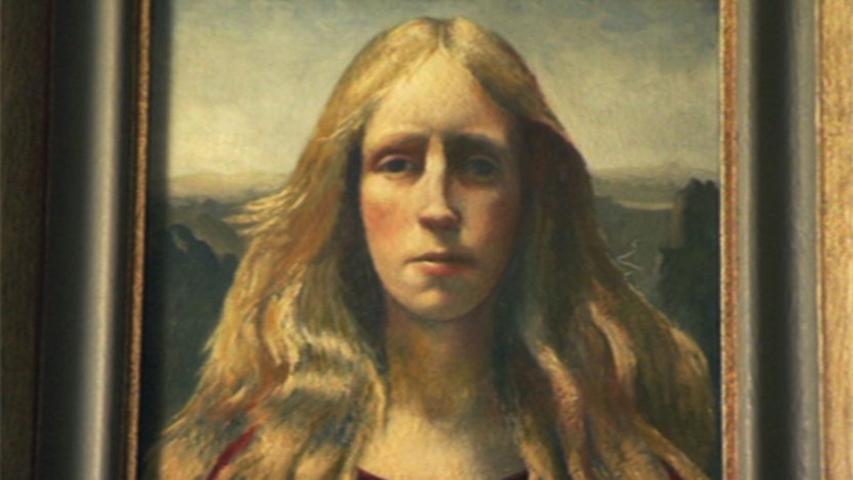 Colour archive footage with voice of artist reading one of her poems about the island fishermen and footage of her in her home painting and sketching. Also archive footage of boat arriving / departing off Bardsey Island. Current interview with Jill Pearcy in Aberystwyth National Library discussing the artist's arrival on the island, her very frugal life and her achievement in making her living solely from her art,a feat that was made more difficult by the fact that she was a woman. Colour shot (present day) of examples of the artist's paintings, eg. Self Portrait, and also of her sketches showing her characteristic elongated faces and almond eyes.