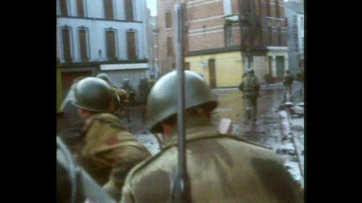 This clip begins with archive footage of soldiers running through their own barricades on Great James Street in pursuit of the rioters.