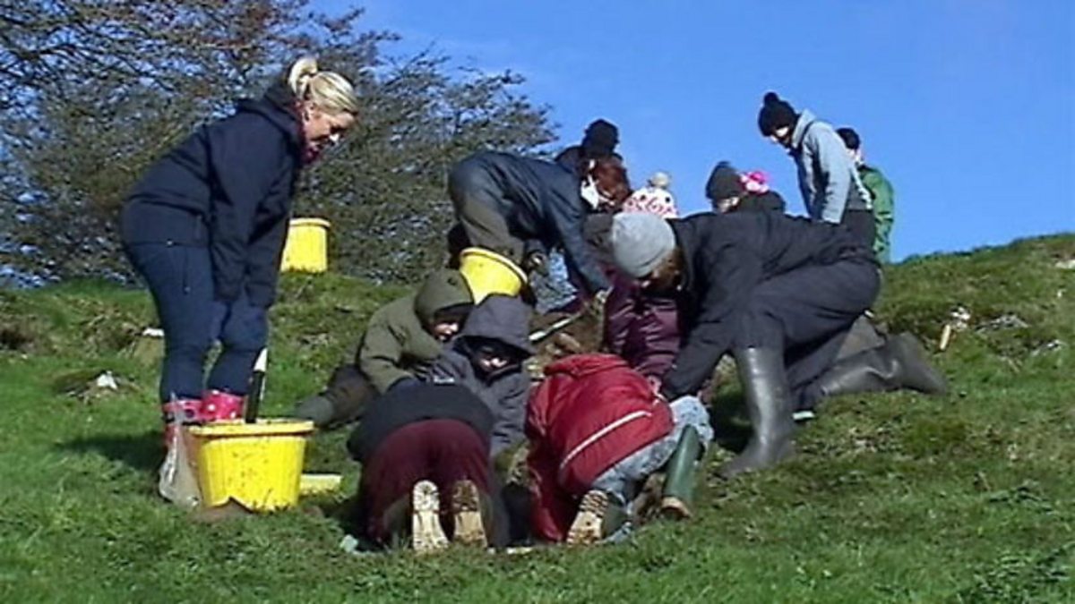 Máire speaks to pupils from Bunscoil Mhic Reachtain about the archaeological dig taking place in the Belfast Hills. Cormac Ó hAdhmaill explains the aim of the dig.
