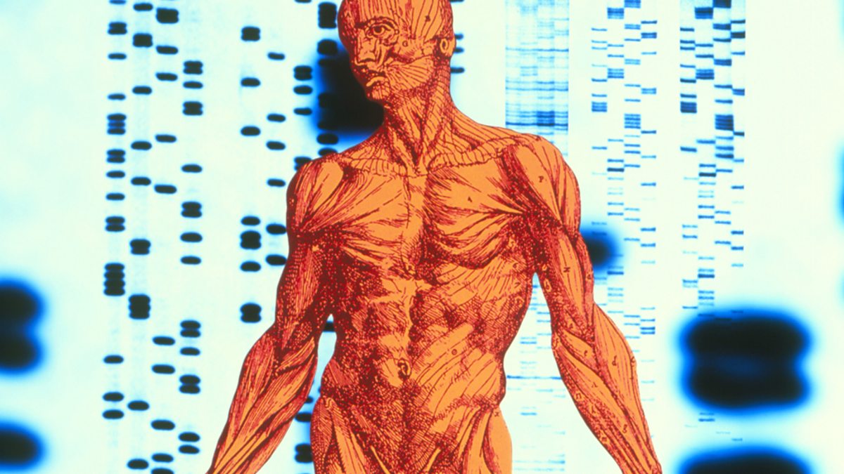 (Image: Conceptual computer artwork of a male figure seen against autoradiograms of genetic sequences. Credit: Science Photo Library)