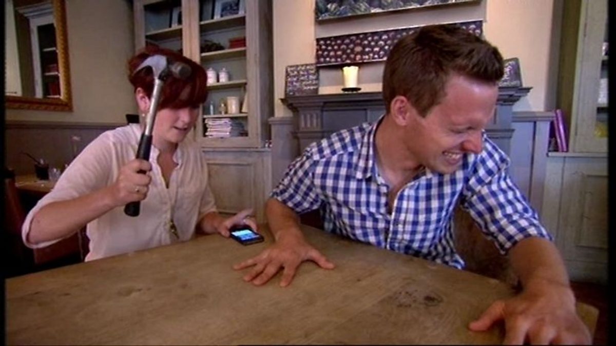 Hammering Greg’s fingers to see if swearing helps with the pain!