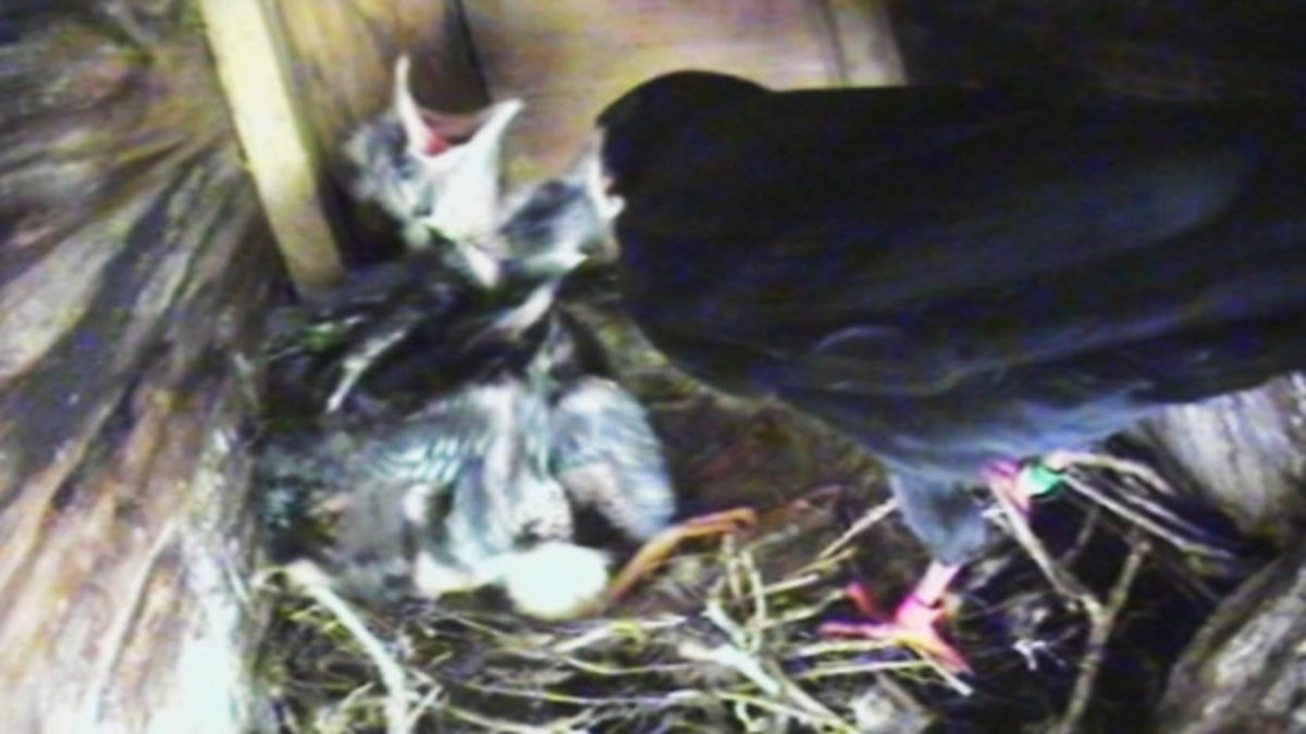 A montage of scenes from a special camera above the nest of a chough whose usual habitat is on seaside cliff ledges. These show chough eggs being incubated, the hatching of the young and the young chicks in the nest.