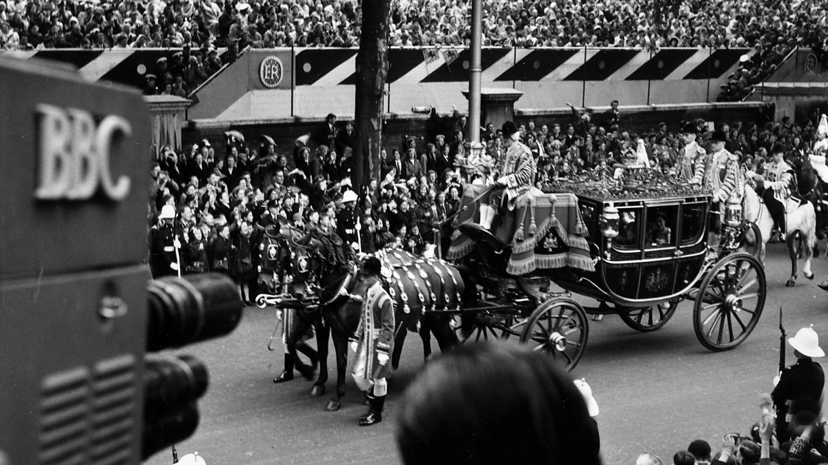 For the first time, TV cameras follow a British monarch's coronation, as the Queen was crowned in 1953. The BBC reports on the events inside Westminster Abbey and outside on the streets of London.
