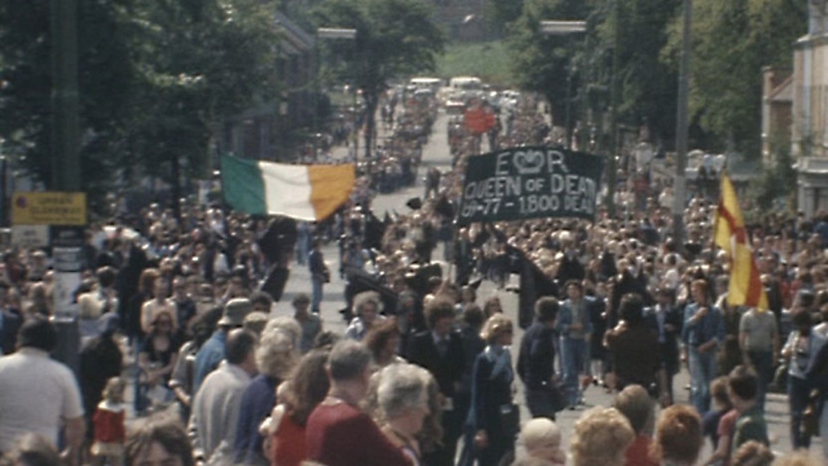 Republicans in Belfast riot and march in protest against Queen Elizabeth II’s Silver Jubilee visit to Northern Ireland (10 to 11 August 1977). They carry a banner bearing the slogan ‘Queen of Death’.