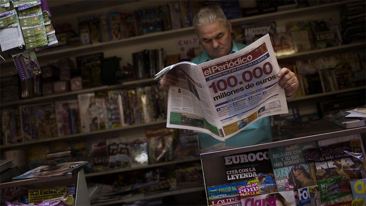 (Image: A man reading a newspaper announcing the recent Spanish bank bailout in Barcelona, Spain. Credit: AP Photo / Emilio Morenatti)