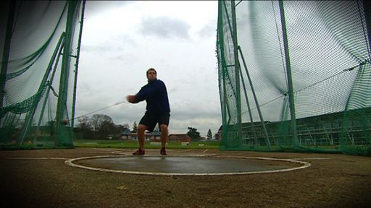 A hammer thrower talks about his training and technique. The path of the throw is drawn on the screen and the energy changes are discussed.