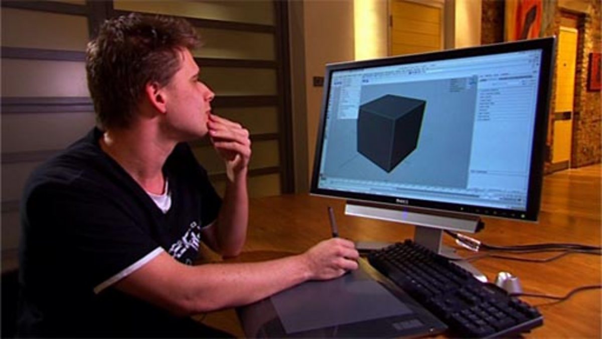 A programmer is shown cutting the corners of a cube in a 3D virtual environment. Using a CAD system, the programmer creates the net of a cube then folds it up 'virtually' to make the solid.
