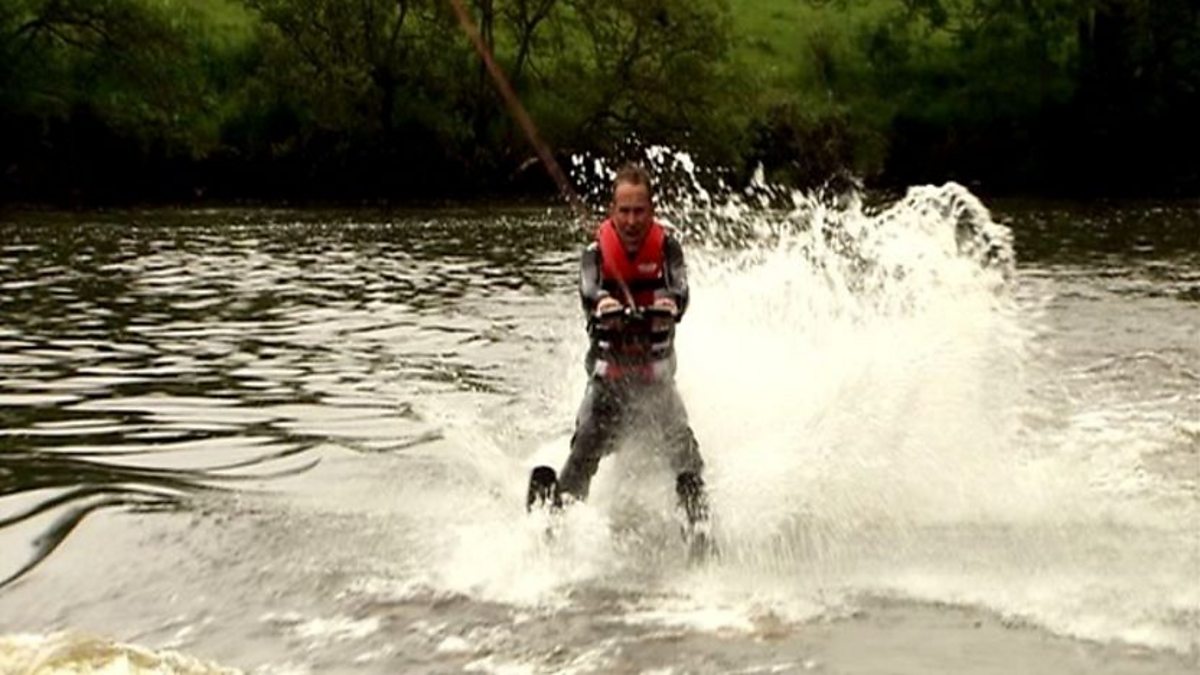 Cormac Ó hÁdhmaill and Antaine Ó Donnaile get competitive as they try water-skiing on the River Bann.