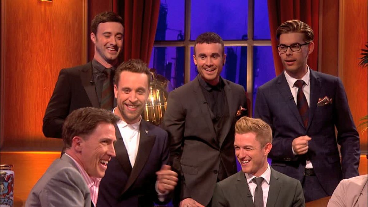 Since Barbara Windsor is the only woman on the show, Rob Brydon suggest that the Overtones should sing a song with him to Barbara. They sing ‘'Have I Told Lately That I Love You’, while Barbara dances.