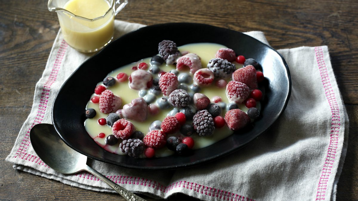 What makes this fantastic for a last-minute, even impromptu, dinner party pud (with interesting Christmas potential) is that you can keep the berries in the deep freeze until needed. I suppose you could, in summer, use fresh berries, though you would lose the contrast between warm rich sauce and sharp icy fruit.