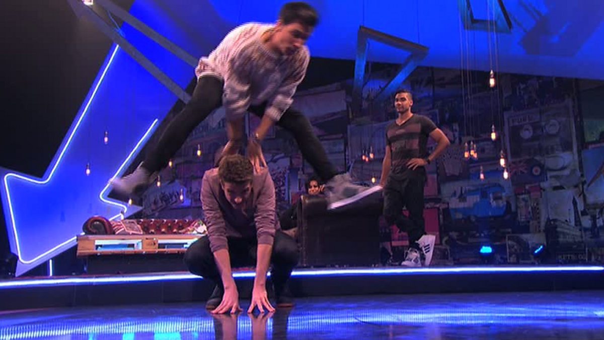 Greg James & Russell Kane demonstrate their gymnastic prowess in front of Olympic silver-medalist & Strictly Come Dancing Star, Louis Smith.