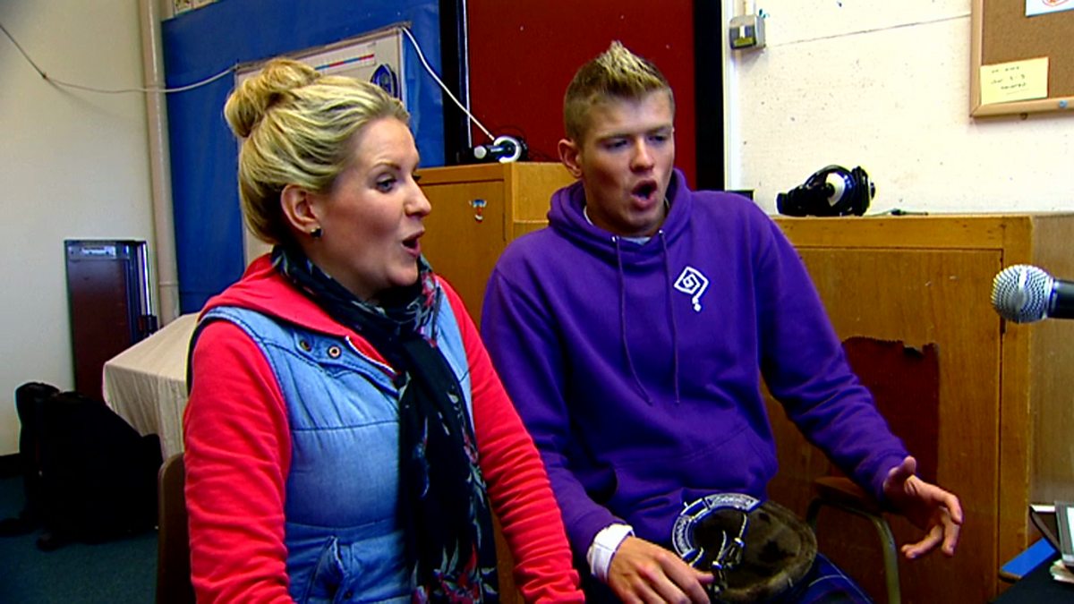 Tha Siobhan is Derek a’ tadhal air Stèisean Rèidio Ionadail Dhùn Omhain