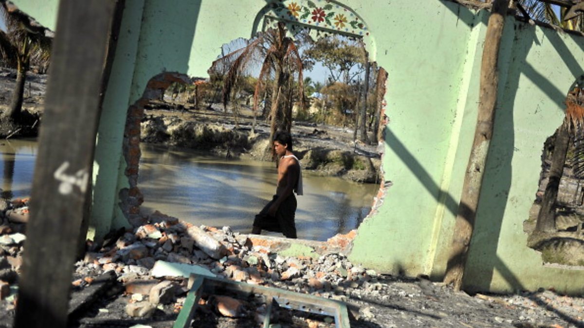 (Image: A man walks past a destroyed mosque in Burma's Rakhine state. Credit: Getty)