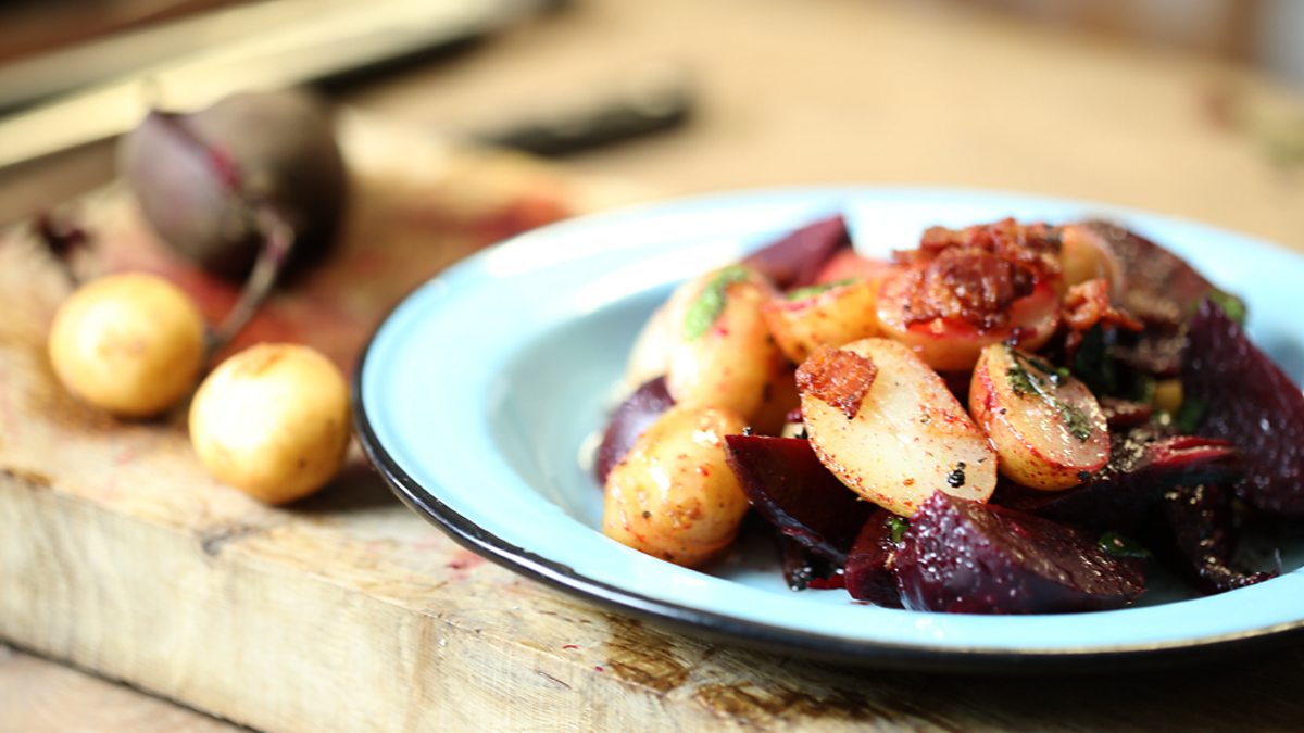 A filling, one-pan dish of bacon and potatoes, fried with beetroot and a horseradish kick.