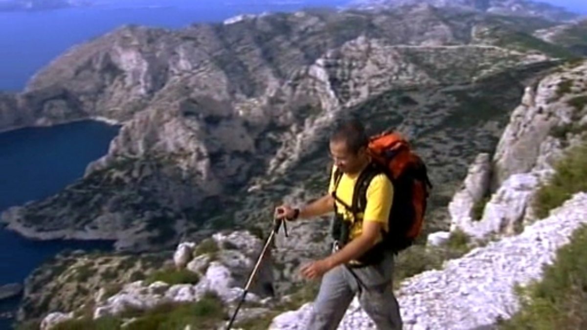 Outdoors enthusiast Serge Mercier takes us on a guided walk along the stunning coastline near Marseille. The interviewer asks how long it will take to get to the peak. Serge describes the direction and explains the meaning of the coloured markings on a rock at the side of the path. Eventually they reach the peak and the interviewer wants to know how high they are.