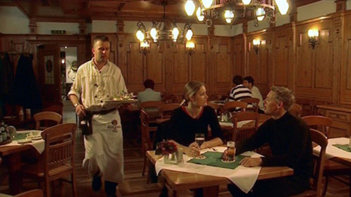 A short description of traditional Bavarian food and drink is followed by a demonstration of how to order food in a restaurant. The narrator asks what people's favourite foods is, then moves on to show how to order food and drink and how to ask if there are any specials and vegetarian options. This is then demonstrated in a restaurant.